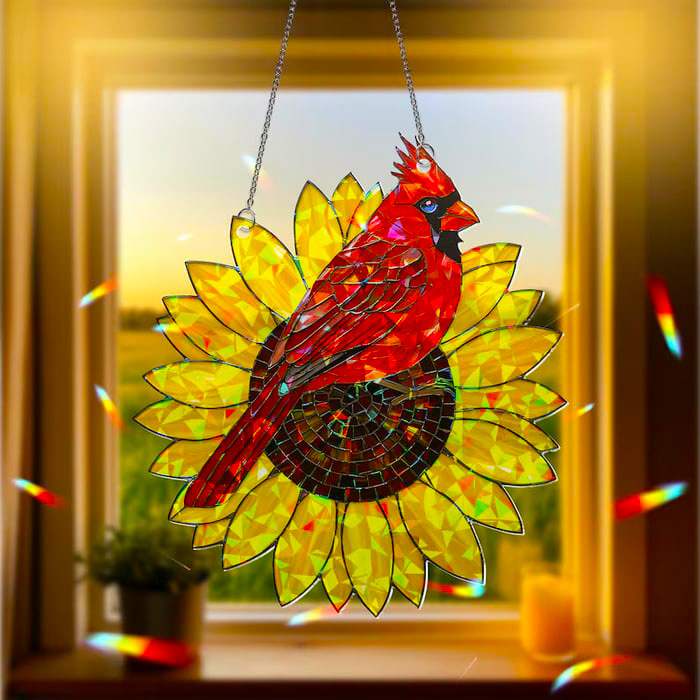 The red cardinal, a timeless symbol of hope, love, and spiritual connection, rests gracefully on a bright sunflower, the flower of happiness and warmth. Together, they create a powerful reminder of joy, resilience, and cherished memories.