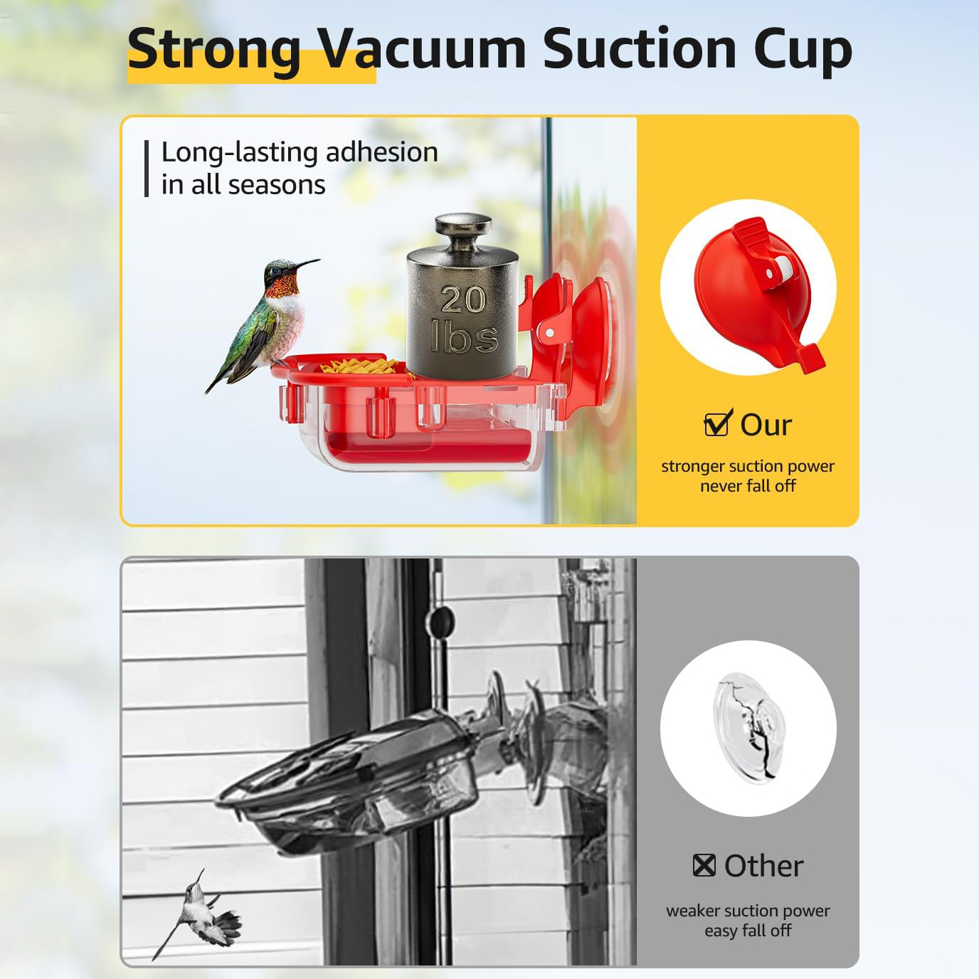 【Strong Vacuum Suction Cups】The hummingbird window feeder is equipped with 2 strong suction cups for secure mounting on windows, ensuring it never falls in all seasons, which provides hummingbirds with a more secure place when feeding and resting.